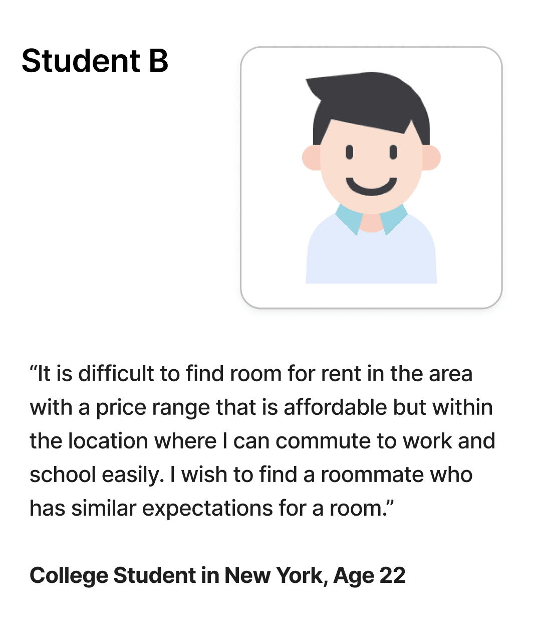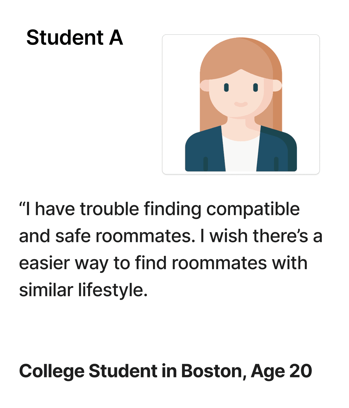 Having conversations with college students across the city allowed me to understood that many issues with the existing apps/sites, or it is often difficult to find a matching roommate with similar living habits.