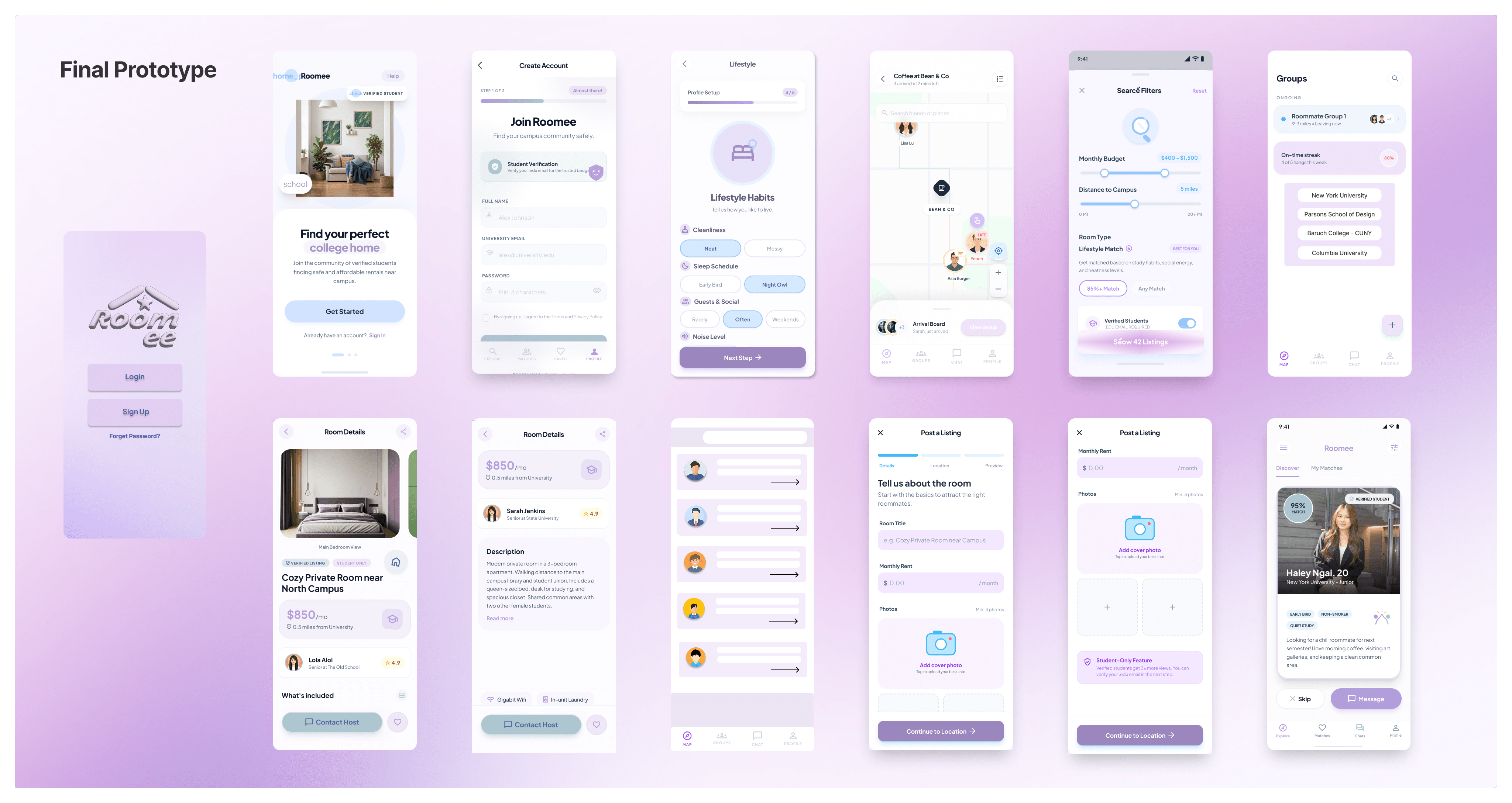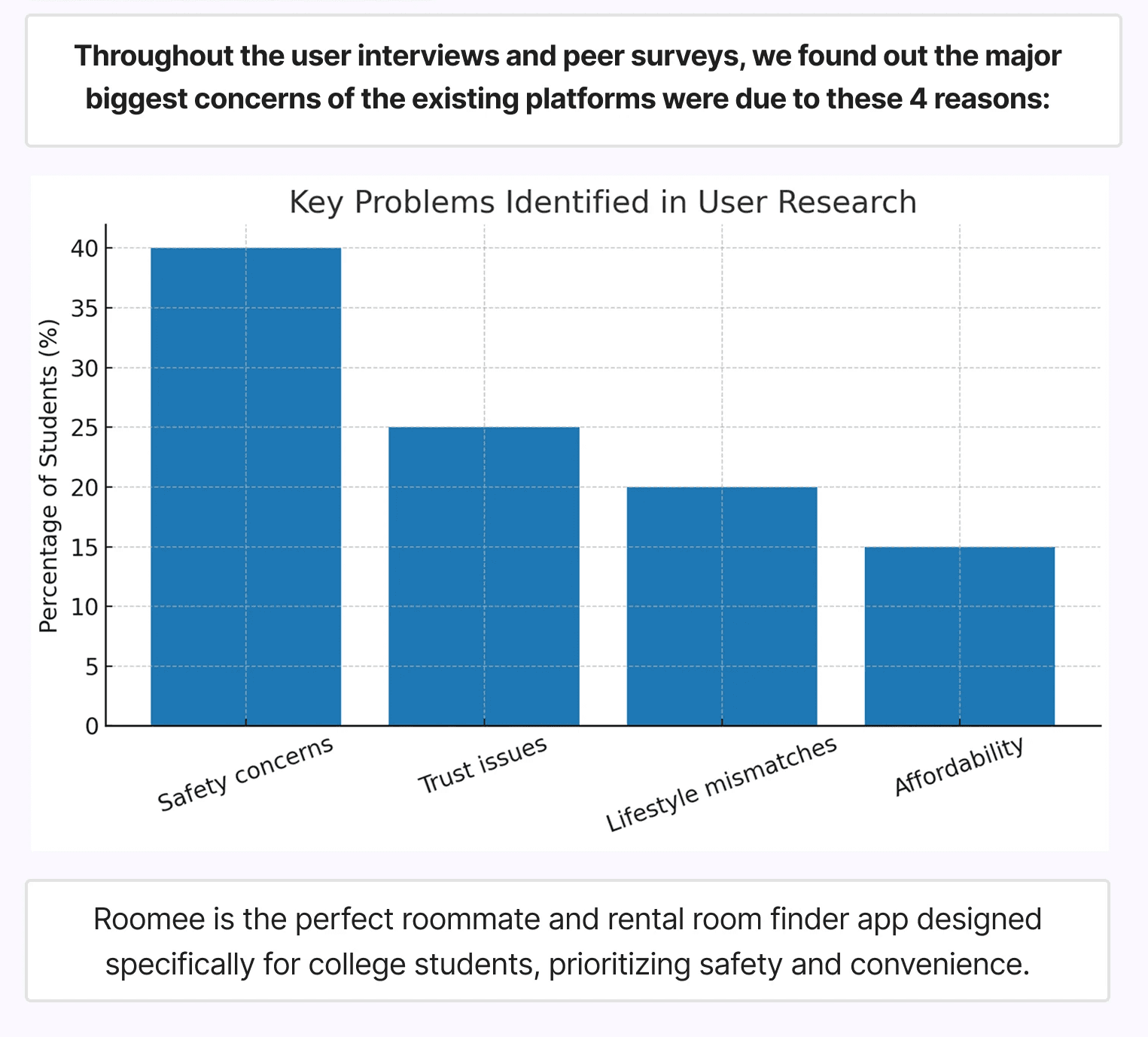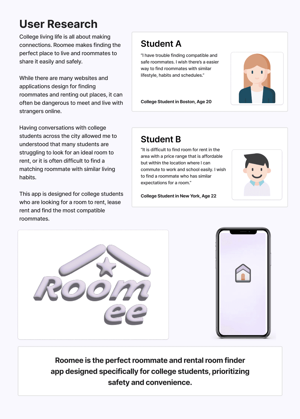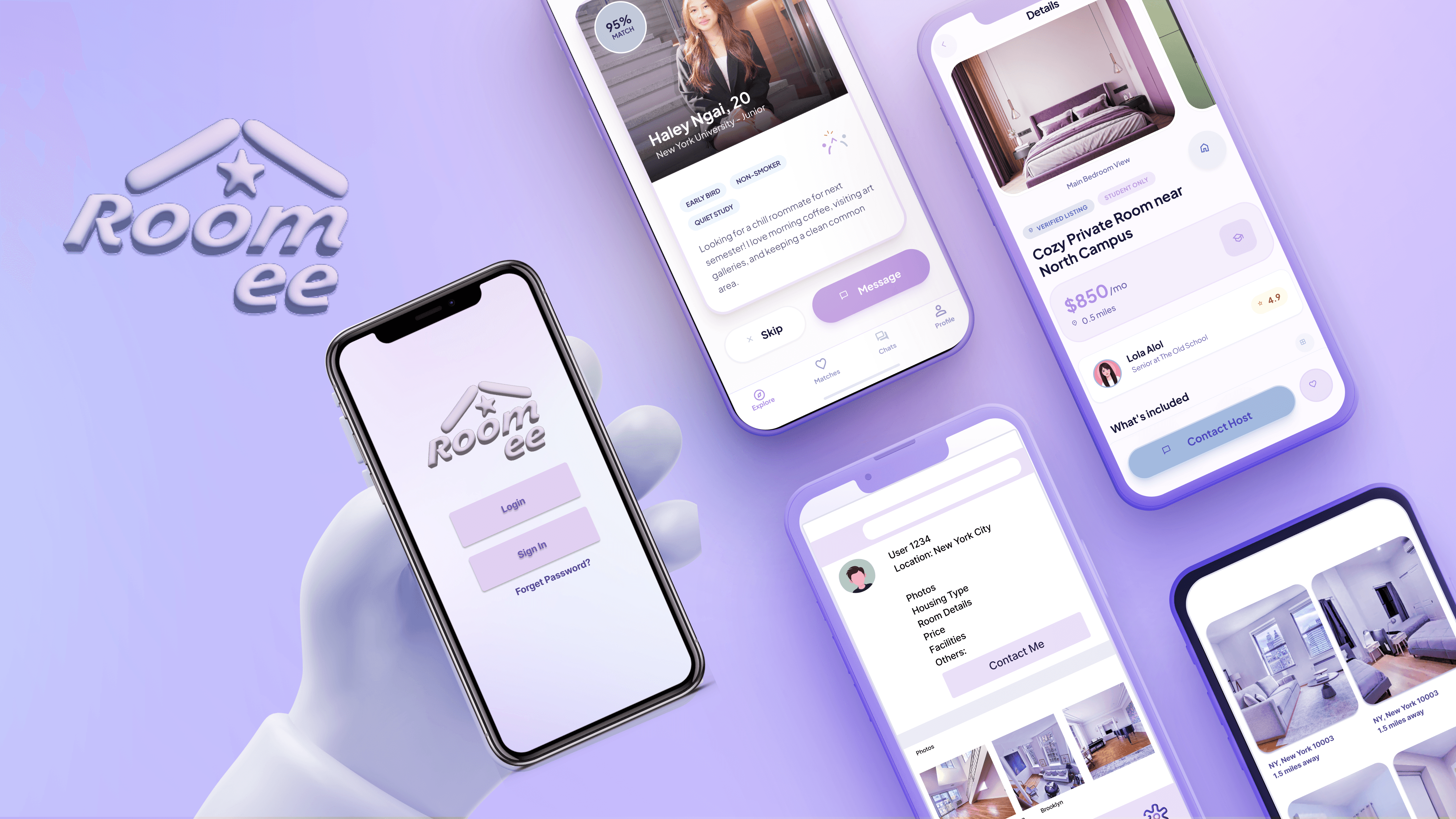 Roomee is a roommate and rental room finder app designed specifically for college students in cities, prioritizing safety and convenience. The platform helps students search for rooms rentals, and find compatible roommates through listings, lifestyle-based matching, and chat features.